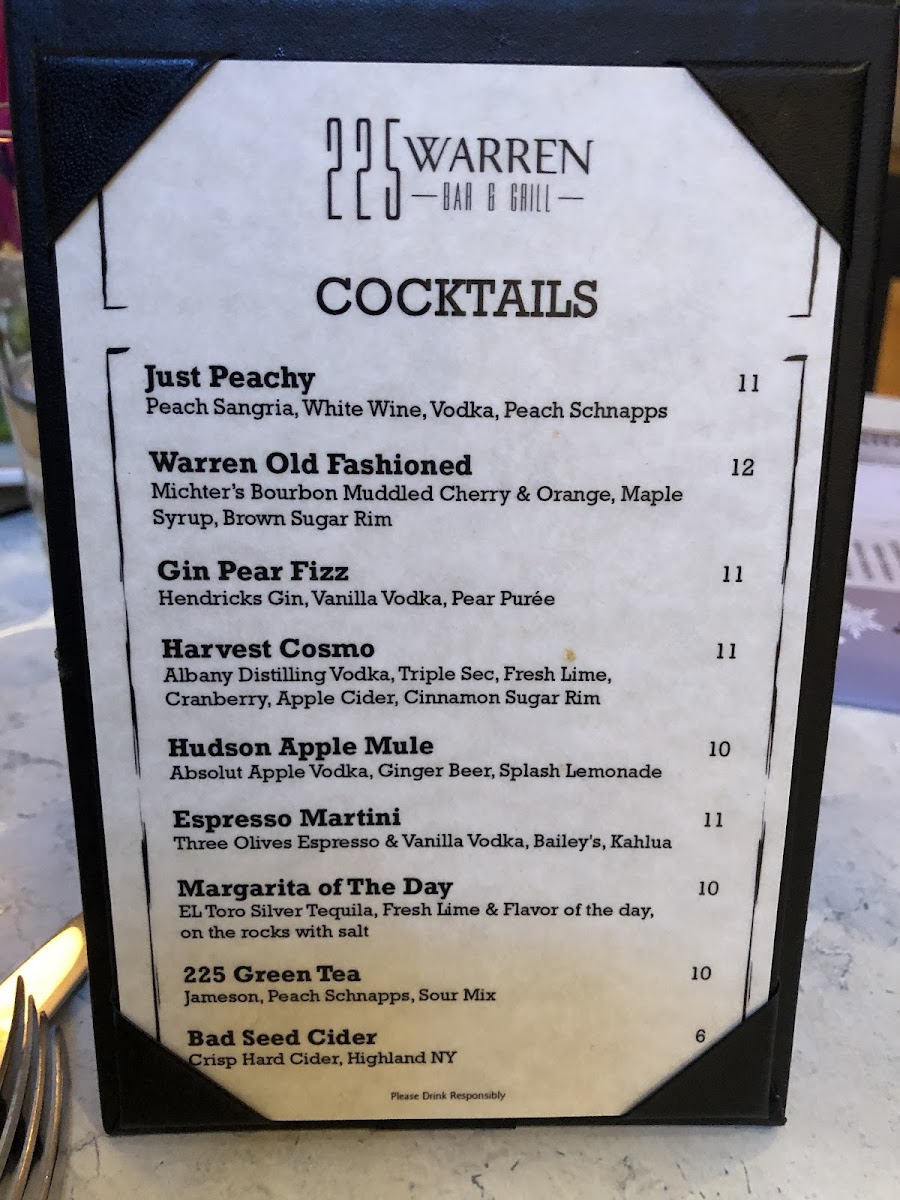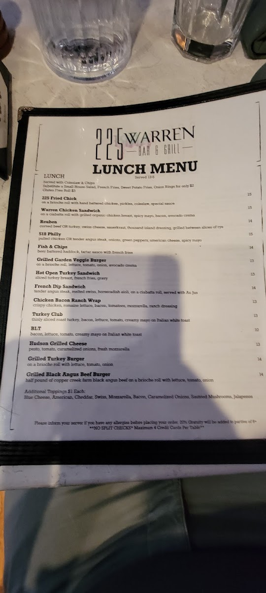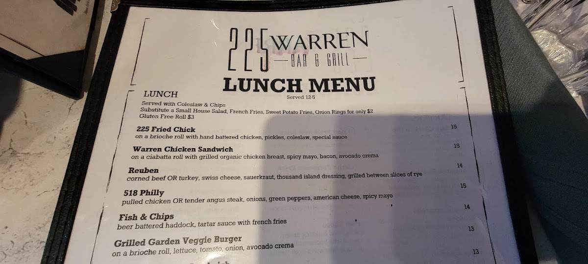 Pair your meal with refreshing cocktails like the Just Peachy Sangria or the smooth Espresso Martini, both perfect for enhancing your dining experience. Customers rave about the quality of food and service here, with highlights including homemade dressings and friendly staff that make you feel like a regular. Join us at 225 Warren Bar and Grill for a meal that promises to impress and satisfy.